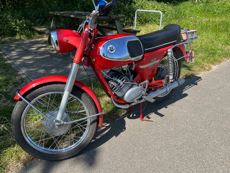 Ich finde es erstaunlich, wie klein das Moped heute wirkt. Früher fühlten wir uns darauf groß wie die Könige. Aber neben meinen anderen Mopeds wirkt sie doch echt winzig.