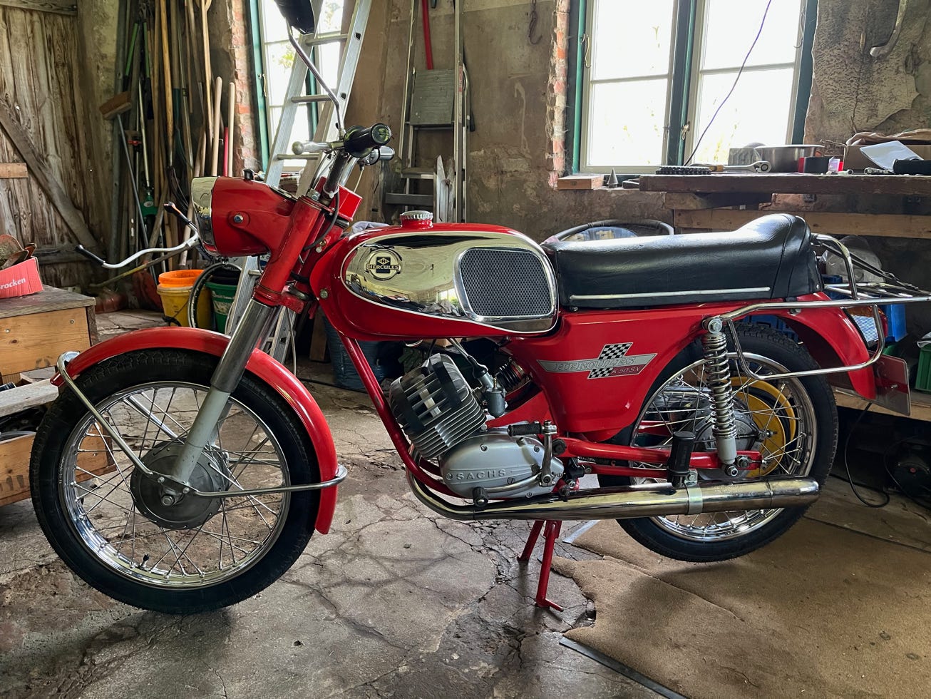 Die K50 stand ehrlich und genau wie beschrieben da, sprang auf den ersten Tritt an und war alles in allem gut in Schuss. Jetzt noch ein paar Kleinigkeiten machen und dann ab zum TÜV. Das dachte ich jedenfalls. Dass mit dem TÜV ging dann auch recht schnell. Aber dann sollten noch ein paar kleine Sachen gemacht werden. Im Endeffekt wurde es ein neuer Motor, der auch nur Probleme machte, eine neue elektronische 12 Volt Zündanlage, neuer Auspuff, der Tank wurde getauscht und zu guter Letzt noch komplett neue Felgen und Speichen. Das hat dann Winter und Frühjahr 2024 gut ausgefüllt. Nun steht Sie aber schön da, finde ich, nicht überrestauriert, aber hübsch.